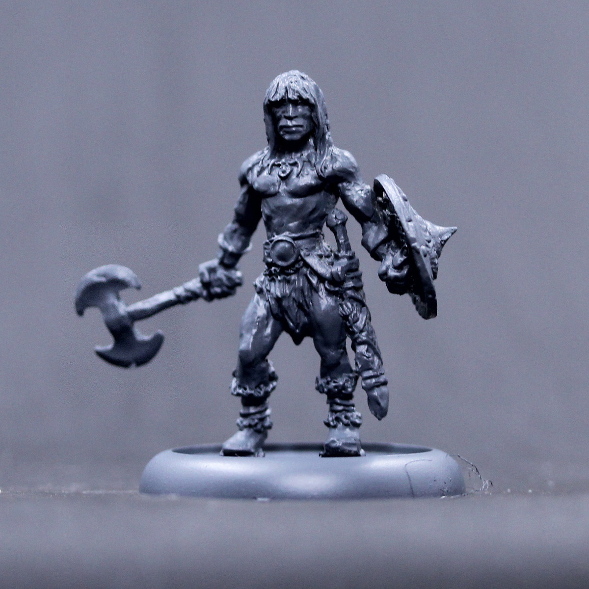 Barbarian Warrior, striding forward with an axe in hand, ready to confront his opponent. Cast in pewter, measuring 32mm. Sculpted by David Soderquist. Bases not included. Not suitable for children under 12.