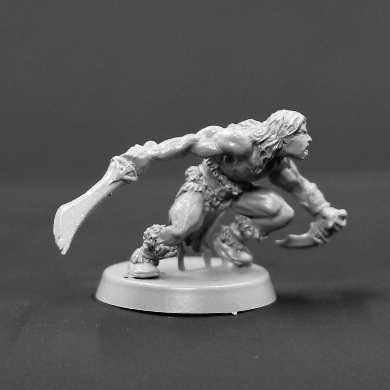 Excellent figure for a barbaric hunter or assassin, with a somewhat rare pose for a metal cast. -