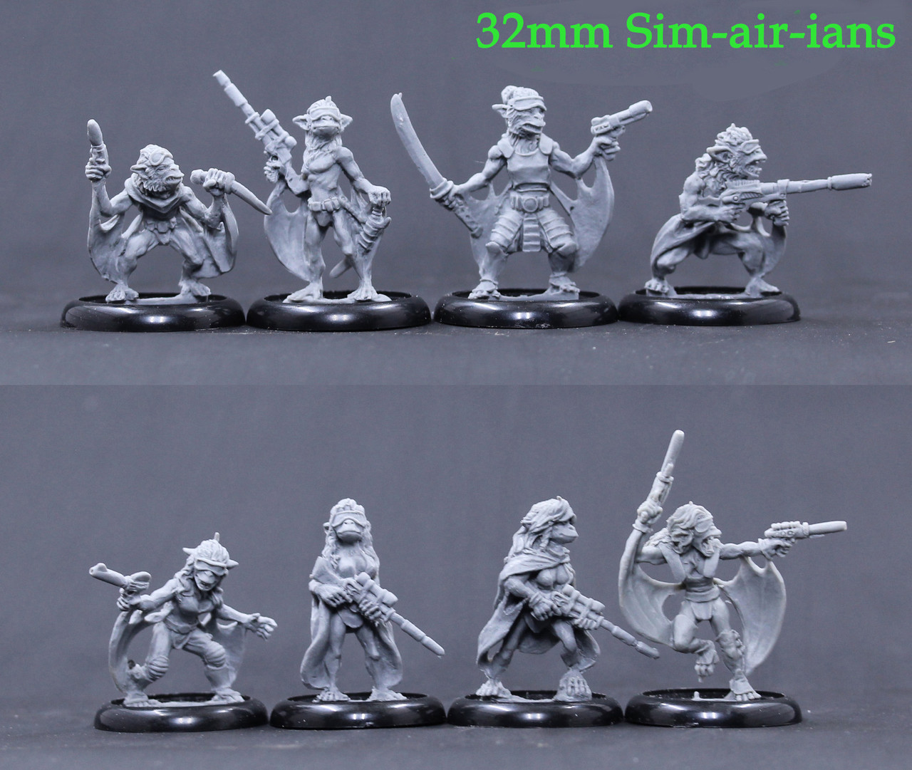 32mm Pewter, set of 8 Sim-air-ians. Sculpt by David Soderquist. Bases not included. not for children under 12 years of age.